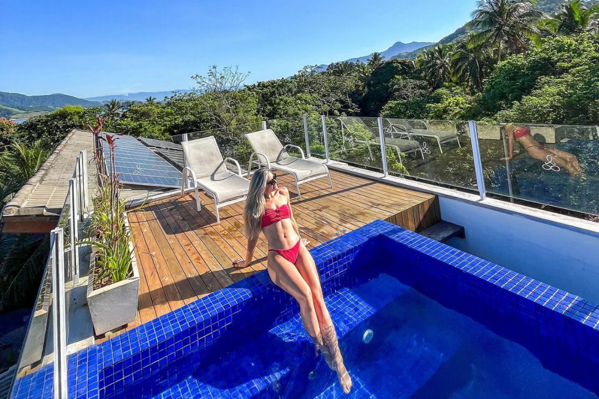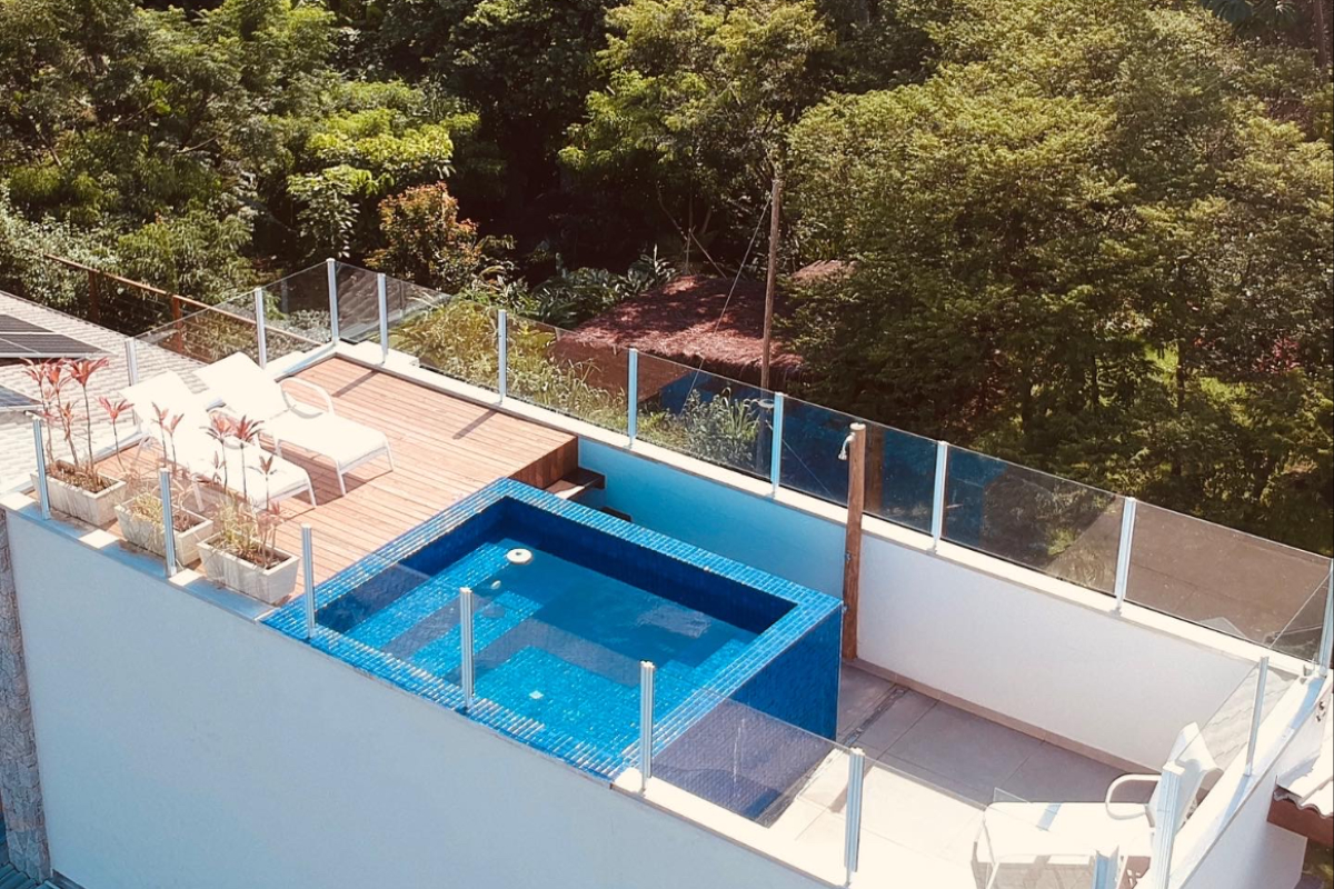 O terreno tem 2 mil metros quadrados, com um jardim enorme e uma cachoeira nos fundos, a 900 metros, que possibilita criar diversas atividades ao ar livre ou fazer trilhas na Mata Atlântica.